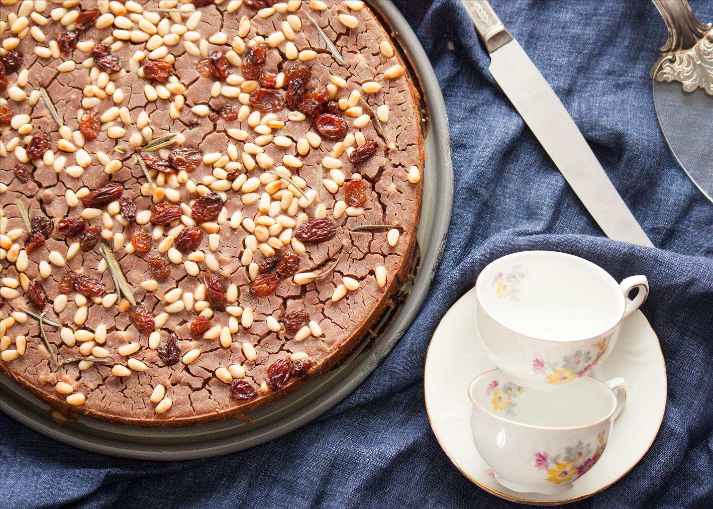 Servite il castagnaccio cospargendo la superficie con una manciata di noci e pinoli.